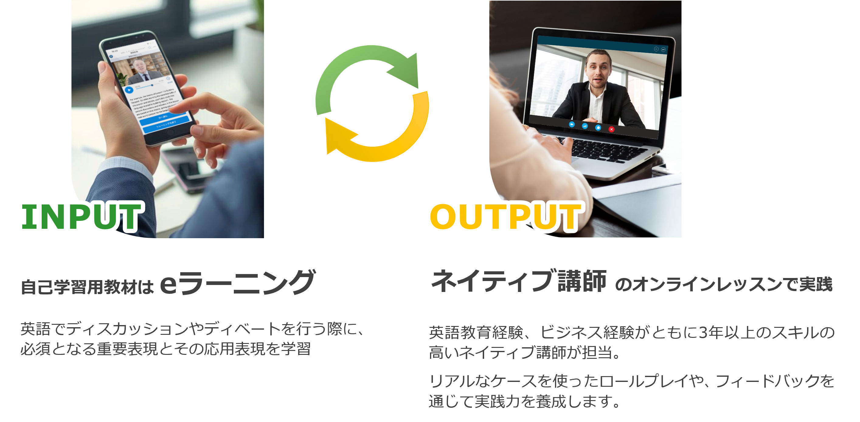 このコースは、グローバルな環境で行われるビジネスシーンに必要な基礎的なディスカッション&ディベート能力と英語力を同時に習得することができる、eラーニングとオンラインレッスンがセットになったコースです。